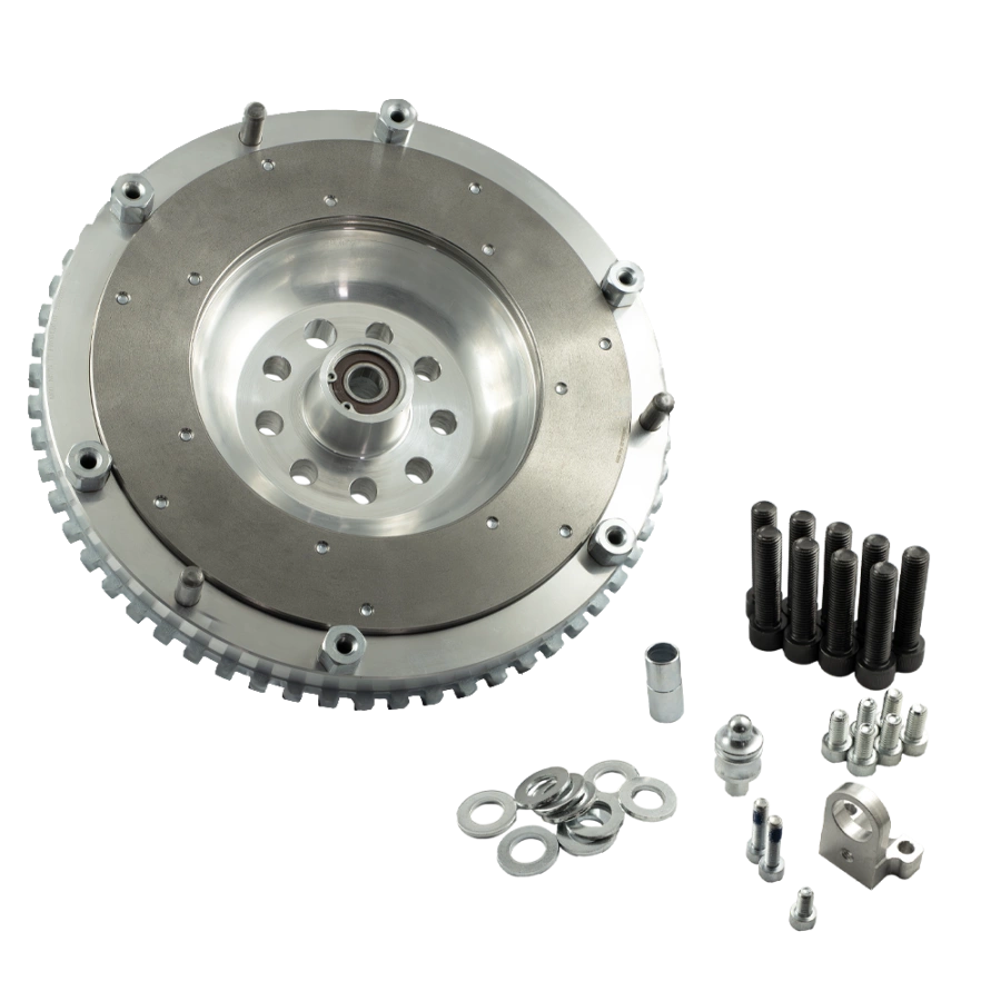 The flywheel base and the gearbox adapter are made of a light and durable aluminum alloy. The set includes crankshaft mounting bolts in class 12.9 (ISO 21269) - tightening torque of 120Nm (thread locker must be used for mounting), bolts for mounting the clutch pressure plate, a custom steel clutch fork pivot pin, and all necessary bolts for mating the engine with the gearbox.