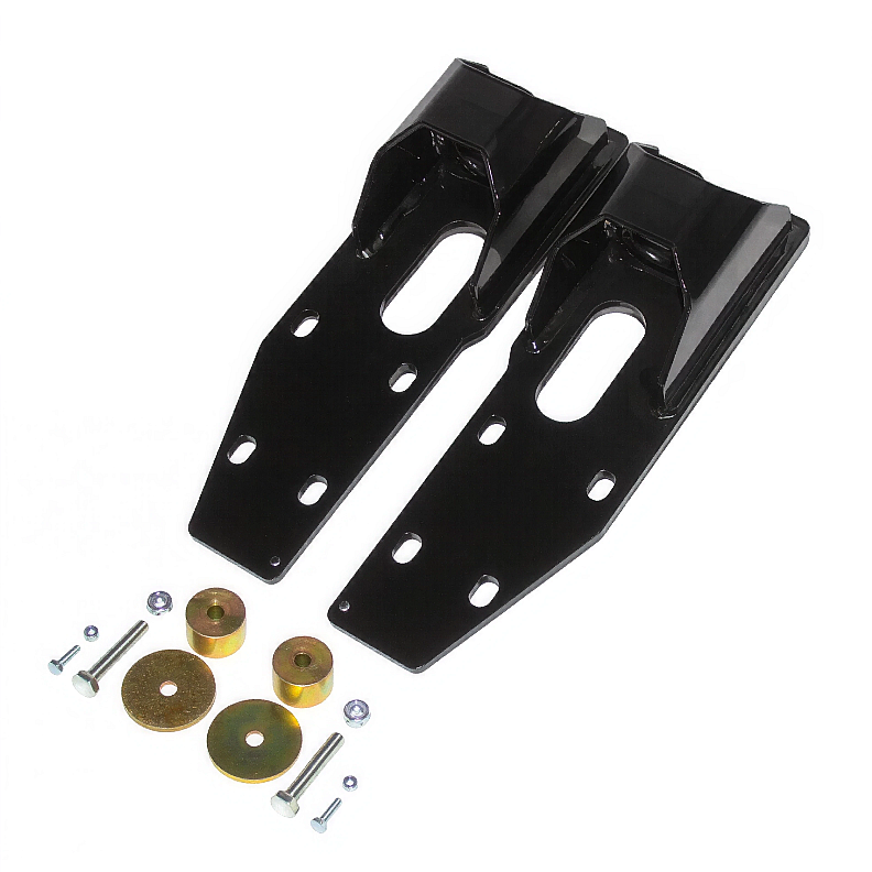 This product is designed to restore the factory caster angle of the front axle knuckle pin when lifting the suspension by 3-6 inches. Drop boxes lower the mounts of the front control arms and the transmission supports, restoring the suspension settings to factory specifications. Additionally, they move the front of the front axle forward, eliminating the risk of the wheel contacting the wheel well.