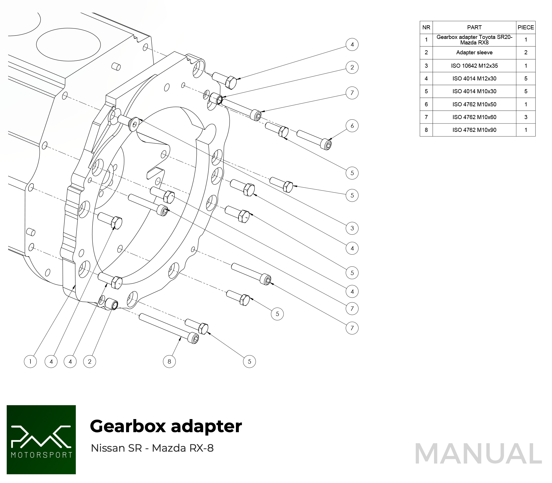 PMC Motorsport adaptateur / kit de conversion / kit d'embrayage Nissan SR SR20DE SR20DET - Mazda RX-8 RX8 SWAP - 240mm / 9.45"