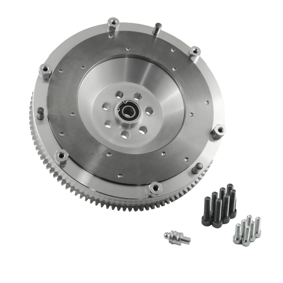 Aluminium-Schwungrad, das die Verbindung (Swap/Conversion) des Mitsubishi 4G63 Motors mit einem manuellen ZF-Getriebe (ZF Friedrichshafen) von BMW ermöglicht.
