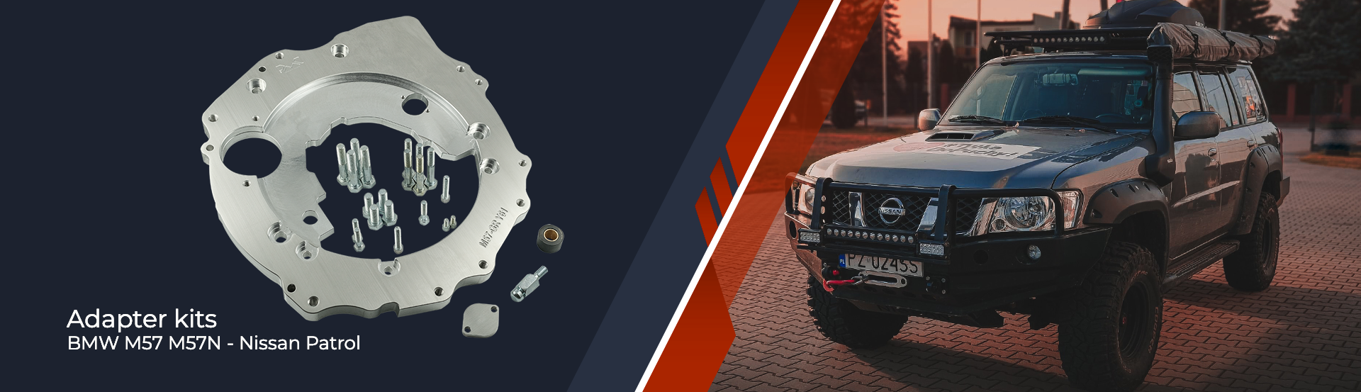 - Aluminiowy adapter skrzyni biegów umożliwiający połączenie (swap / konwersję ) 6 cylindrowego silnika BMW M57 3.0 Diesel z skrzynią biegów Nissan Patrol Y61 ZD30 / Y61 TD42