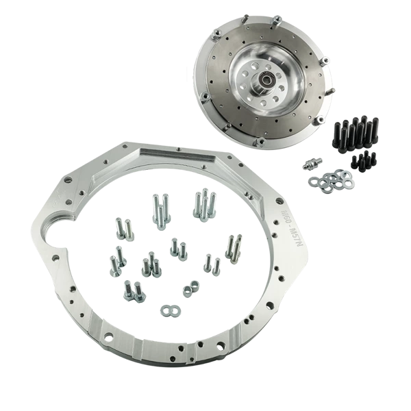 A base do volante do motor e o adaptador da caixa de velocidades são feitos de uma liga de alumínio leve e durável. O kit inclui parafusos de montagem para o virabrequim na classe 12.9 (ISO 21269) - torque de aperto dos parafusos 120Nm (é necessário usar trava-rosca para a montagem), parafusos para a montagem do disco de pressão da embreagem, um pino de suporte de garfo de embreagem customizado em aço e todos os parafusos necessários para o acoplamento do motor à caixa de marchas.