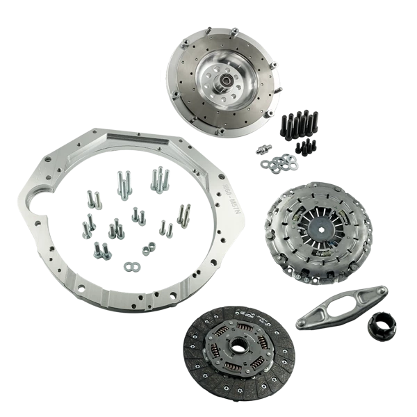 La base del volante de inercia y el adaptador de la caja de cambios están hechos de una aleación de aluminio ligera y duradera. El kit incluye tornillos de montaje del cigüeñal en clase 12.9 (ISO 21269) - par de apriete de 120Nm (se debe usar fijador de roscas para el montaje), tornillos para montar el plato de presión del embrague, un pasador de pivote de horquilla de embrague de acero personalizado y todos los tornillos necesarios para acoplar el motor a la caja de cambios.