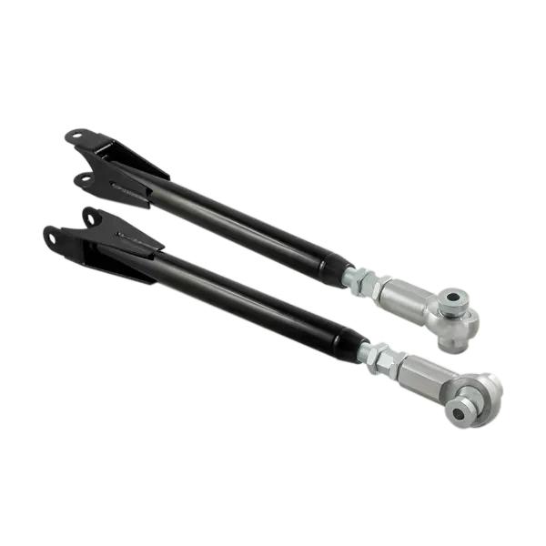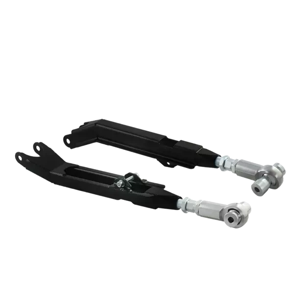 Juego de brazos ajustables y casquillos de aluminio para BMW E46. Los brazos están fabricados en acero de alta calidad, soldados con precisión y pintados en negro. Pensados para suspensiones roscadas y diseñados para uso en motorsport.